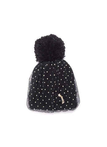 Detachable pin dot tulle overlay pompom knit beanie - Venna - Black