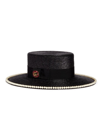 Glass pearl logo brooch straw boater hat - Gucci - Black
